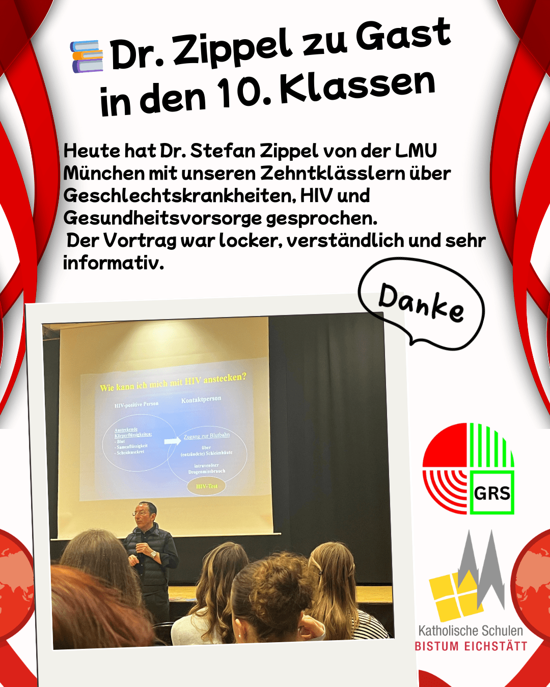 Am 26. Februar 2026 fand in der dritten bis sechsten Stunde ein Vortrag für alle Schülerinnen und Schüler der zehnten Klassen statt. Referent war Dr. Stefan Zippel von der Ludwig Maximilians Universität München. Er informierte umfassend über Geschlechtskrankheiten und HIV sowie deren Bedeutung für die Gesundheitsvorsorge.
